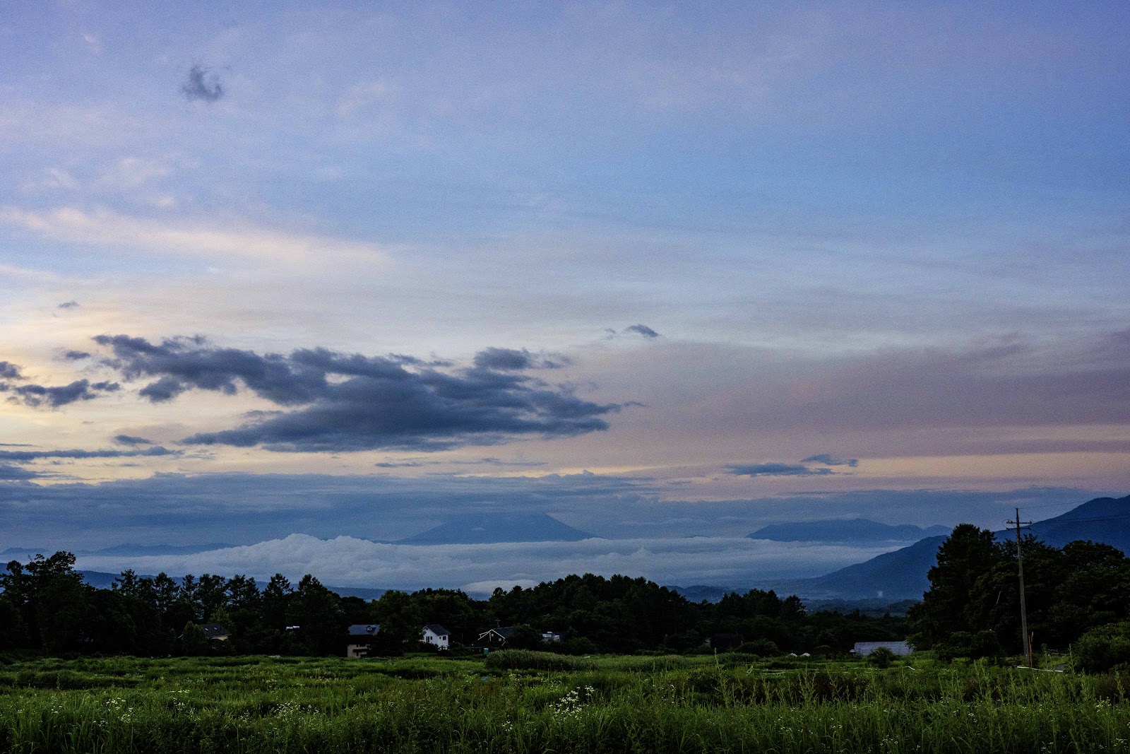 中腹にまとわりつく雲の下には韮崎の街並みが見えてます